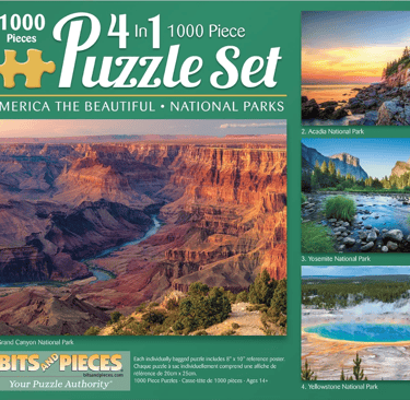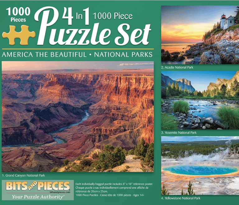Bits and Pieces – 4-in-1 Multi-Pack, America the Beautiful, features four beautifully illustrated 1000-piece jigsaw puzzles celebrating America’s National Parks. Each puzzle offers a unique and challenging experience with high-quality, random-cut pieces made from recycled cardboard. Individually bagged with reference posters, this durable and eco-friendly set is perfect for adult puzzlers and makes a thoughtful gift for nature and puzzle lovers alike.