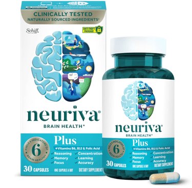 NEURIVA Plus Brain Supplement is a clinically tested nootropic designed to support memory, focus, and mental clarity. It features Neurofactor from coffee fruit extract to boost BDNF, a key brain protein, along with phosphatidylserine and B vitamins B6 and B12 to enhance cognitive function, brain energy, and mood. Made with high-quality, vegetarian, and non-GMO ingredients, it offers convenient, once-daily support for overall brain health.
