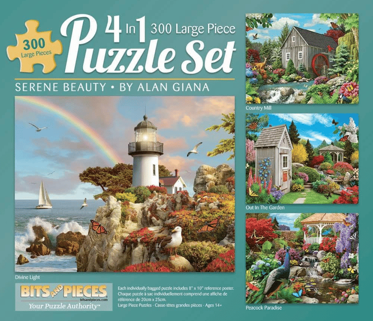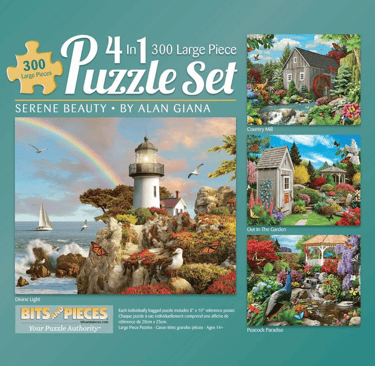 Bits and Pieces – 4-in-1 Multi-Pack, Serene Beauty includes four 300-piece jigsaw puzzles featuring the serene artwork of Alan Giana. Made from recycled materials with unique, random-cut pieces, each puzzle offers a relaxing yet engaging experience. Perfect for adults and families alike, this high-quality set makes a thoughtful and visually beautiful gift.