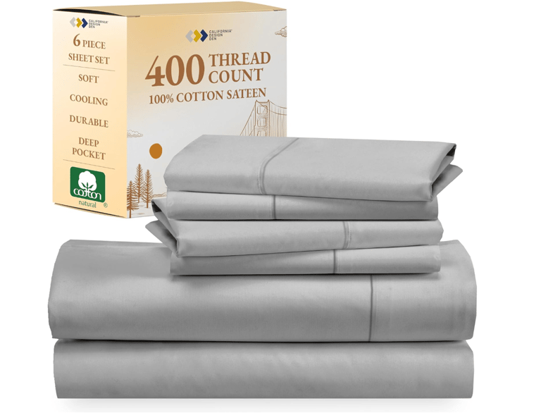 California Design Den 6-Piece Sheet Set offers breathable, hotel-quality comfort with 100% cotton and a smooth 400 thread count sateen weave—ideal for hot sleepers and hot flash relief. This set includes a deep pocket fitted sheet, flat sheet, and four pillowcases, all in a calming light grey. Soft, durable, and OEKO-TEX certified, they stay cool, resist wrinkles, and get even softer with every wash.