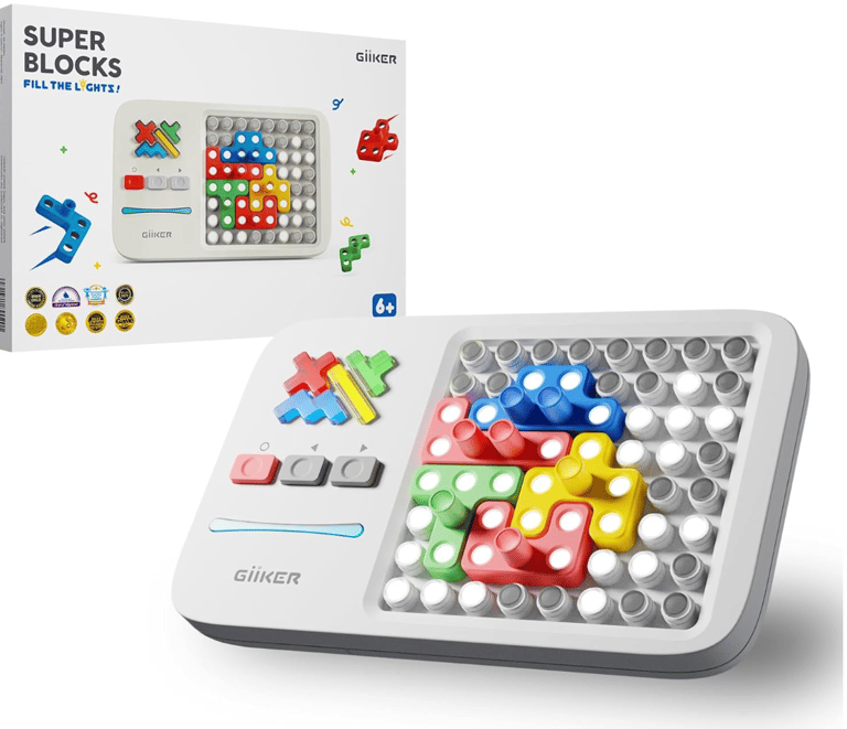 GiiKER Super Blocks STEM Toy is a compact electronic puzzle game offering over 1,000 pattern-matching challenges that engage the brain and build critical thinking and planning skills. Designed to provide a stimulating, screen-free experience, it's ideal for travel, focus support, and mental exercise. Players use colored pieces to cover lighted areas on the board, guided by intuitive visual cues that add variety and depth to each challenge.